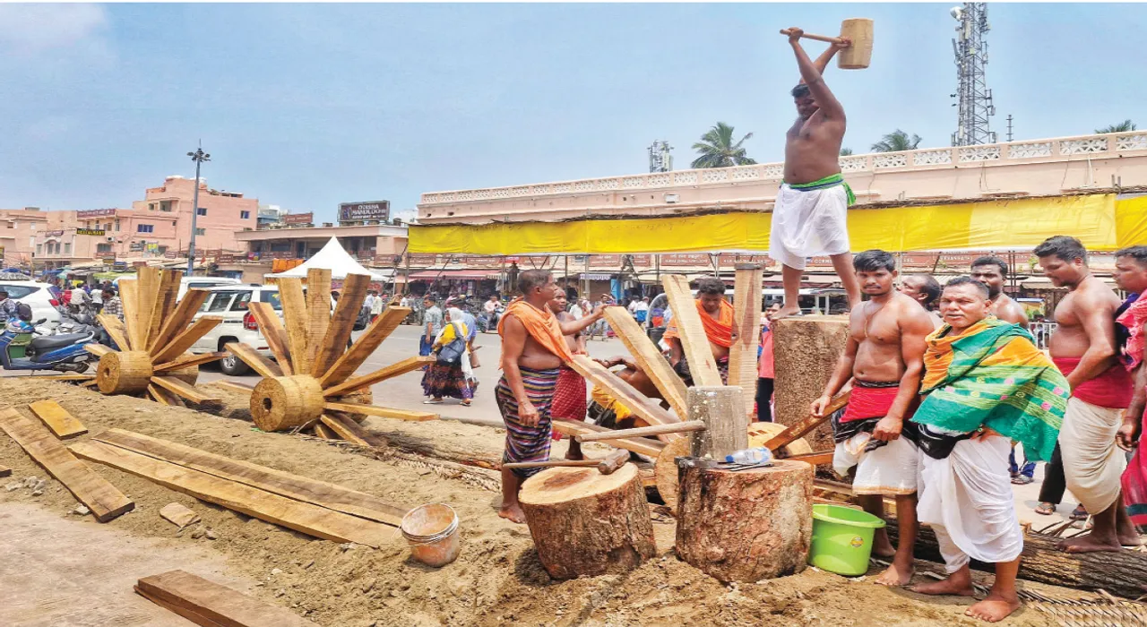 ତୁମ୍ବରେ ଅଖ ବିନ୍ଧ ପାଇଁ ଭୋଇ ସେବକ ମାନଙ୍କ ସହଯୋଗରେ ତୁମ୍ବ ବିନ୍ଧ କାରିଗରଙ୍କୁ ଯୋଗାଇ ଥିଲେ। ତୁମ୍ବ ବିନ୍ଧ କାରିଗର ତିନି ରଥର ଗୋଟିଏ ଗୋଟିଏ ତୁମ୍ବର ଅଖ ବିନ୍ଧ କାର୍ଯ୍ୟ ଶେଷ କରିଛନ୍ତି।ଆସନ୍ତାକାଲି ତିନି ରଥର ପଇ ବିନ୍ଧ ଅନୁକୂଳ ପୂଜା ତିନି ରଥର ମୁଖ୍ୟ ମହାରଣାଙ୍କ ଦ୍ୱାରା ସମ୍ପନ୍ନ ପରେ ତିନିରଥର ପଇ ବିନ୍ଧ କାର୍ଯ୍ୟ ଆରମ୍ଭ ହେବ। ଏଥିସହ ଆଜି ତିନି ରଥର ୧୧ଟି ଲେଖାଏଁ ଗୁଜ, ୯ଟି ଲେଖାଏଁ ଜଳଯନ୍ତ୍ର ନିର୍ମାଣ ଶେଷ ହୋଇ ପାଞ୍ଚ ଦଣ୍ଡାକୁ ବାନ୍ଧି ରଖିବାକୁ ତିନି ରଥର କୁଡ଼ୁକା ଚଉପଟ କାର୍ଯ୍ୟ ଜାରି ରହିଛି। ଏଥିସହ ତିନି ରଥର ରୂପକାର ସେବକମାନେ ଗୁଜରେ ନୃସିଂହ ରୂପ ଖୋଦେଇ ଜାରି ରଖିଛନ୍ତି। ଦୋଳବେଦୀ ଅସ୍ଥାୟୀ କମାରଶାଳରେ ଓଝା ସେବକମାନେ ଚକାଡେରା ନୀତି ପାଇଁ ଆବଶ୍ୟକ ତିନି ରଥର ୧୨ଟି ଅନୁକୂଳ ତୁମ୍ବ ପାଇଁ ଆବଶ୍ୟକ ପନ୍ଦାରିର ମଠା କାର୍ଯ୍ୟ ଶେଷ କରିଛନ୍ତି। ତିନି ରଥର ୮ଟି ଲେଖାଏଁ ୨୪ଟି ପନ୍ଦାରି ଚାବି ଶେଷ କରି ଅରକଣ୍ଟା ନିର୍ମାଣ ଜାରି ରଖିଛନ୍ତି। ଆଜି ରଥ କାମରେ ମୋଟ ୧୮୩ ଜଣ ସେବକ ଅଂଶଗ୍ରହଣ କରିଥିଲେ।