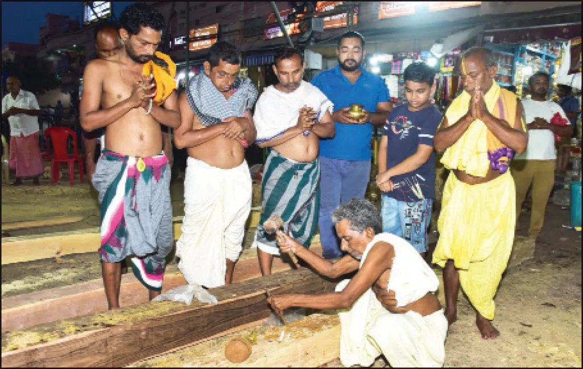 ଆଜି ନୃସିଂହ ଚତୁର୍ଦ୍ଦଶୀରେ ତିନି ରଥ ପାଇଁ ଭୋଇ ସେବକମାନେ ଗତକାଲିଠାରୁ ତିନି ରଥ ଚାଳିକୁ ଗୁଜ, କୁଡ଼ୁକା ଏବଂ ଜଳଯନ୍ତ୍ର ନିର୍ମାଣ ପାଇଁ ୨୦ଟି ଲେଖାଏଁ ୧୨ ଫୁଟିଆ ଧଉରା ଓ ଅସନ ଗୋଟାକାଠ ଯୋଗାଇ ଦେଇଥିଲେ। ତିନି ରଥର ମୁଖ୍ୟ ମହାରଣାମାନେ ନଡ଼ିଆ ବାଡ଼େଇ ଅନୁକୂଳ ପୂଜାପୂର୍ବକ ଗୁଜ ପାଇଁ ଉଦ୍ଦିଷ୍ଟ ୧୨ ଫୁଟିଆ ଧଉରା କାଠଗୁଡ଼ିକର ଉପର ଅଂଶକୁ ବାରିସିରେ ହାଣି ସମତଳ କରି ଚଉପଟ (ଚାରିକୋଣିଆ) କରିଥିଲେ। ଅପରାହ୍ଣରେ ମହାପ୍ରଭୁଙ୍କ ଯାତଭୋଗ ପରେ ଚନ୍ଦନ ଠାକୁର ଚନ୍ଦନ ପୋଖରୀକୁ ବିଜେ ସମୟରେ ତିନିରଥର ମହାରଣା ସେବକ ଗୁଜ ଅନୁକୂଳ ପାଇଁ ରୂପକାର ସେବକଙ୍କୁ ତିନି ବାଡ଼ର ଗୋଟିଏ ଲେଖାଏଁ ଚଉପଟ ହୋଇଥିବା ଗୁଜ କାଠ ଯୋଗାଇ ଦେଇଥିଲେ। ଏଥିସହ ଦୋଳବେଦୀଠାରେ ମହାପ୍ରଭୁଙ୍କ ପାଟ ଡୋର ବୋଳାଯିବା ପାଇଁ ଆବଶ୍ୟକ ୩୦ଟି ବାଉଁଶ ନଳ ଏବଂ ୩୦ଟି ବାଉଁଶ କାଠି ନିର୍ମାଣ ଶେଷ କରିଛନ୍ତି।